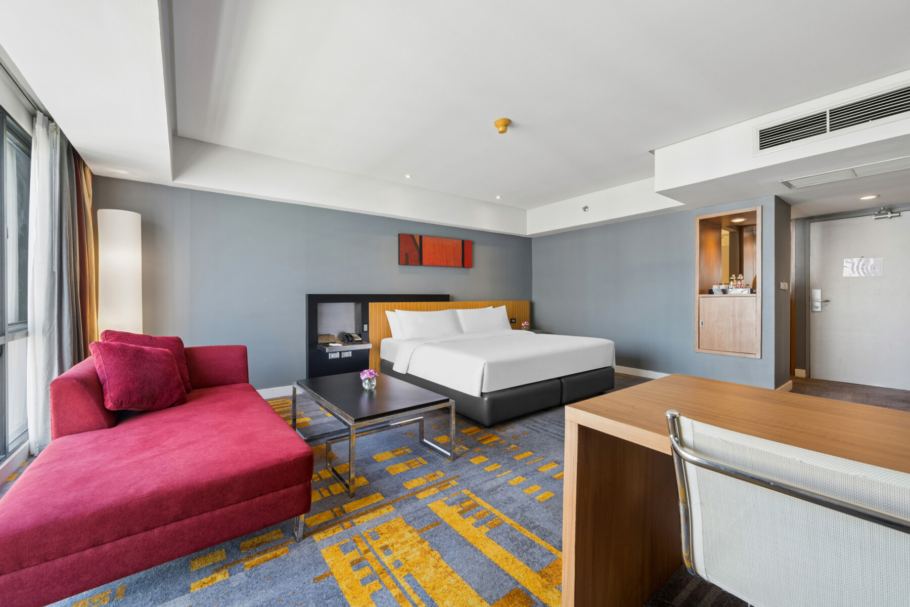 This is our most spacious suite where guests can truly feel at home. The 45 sqm suite has a living area corner with a comfortable sofa and creative lighting to set the mood for relaxation or work. The tastefully designed bedroom comes with a choice of a king size or two queen beds. Additional features include LED TV and high speed Wi-Fi Internet.
